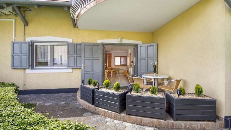 Gelegen in Balatonmáriafürdő, nur 25 km vom Thermalsee Hévíz entfernt, direkt am Strand. Die Umgebung bietet zahlreiche Möglichkeiten zum Wandern und Windsurfen.