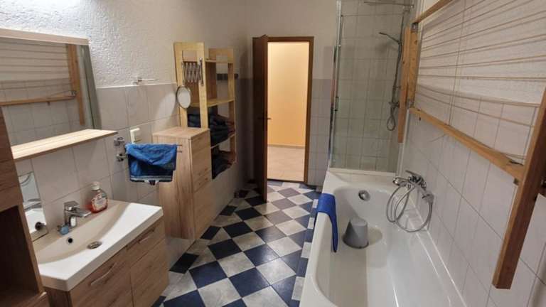 Die Ferienwohnung umfasst drei Schlafzimmer, ein Wohnzimmer und ein Badezimmer mit Dusche. Handtücher und Bettwäsche werden bereitgestellt. Die Raumgestaltung unterstützt eine gemütliche und heimelige Atmosphäre, die sich ideal für Familienferien eignet.