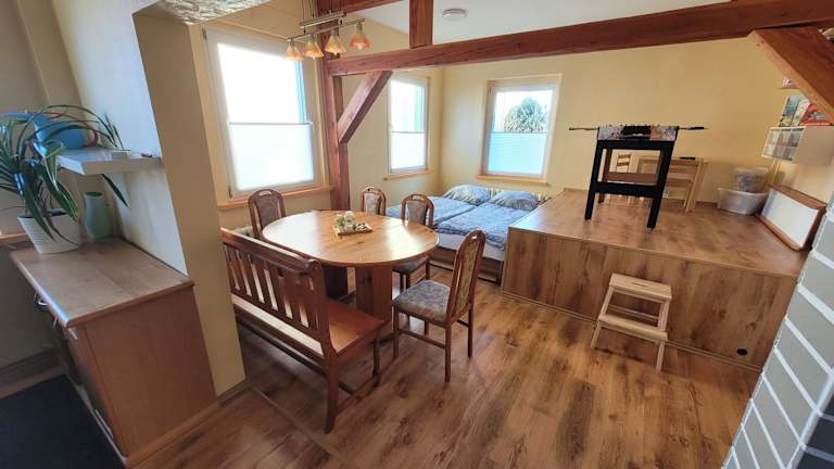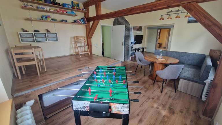 Die familienfreundliche Ferienwohnung bietet eine einladende Atmosphäre und zahlreiche Annehmlichkeiten für Familien. Die Unterkunft besteht aus drei Schlafzimmern, einem Wohnzimmer und einer voll ausgestatteten Küche, die ideal für gemeinsame Ferienmahlzeiten ist. Ein kostenloser Privatparkplatz steht zur Verfügung, ebenso wie ein Kinderspielplatz für die kleinen Gäste.