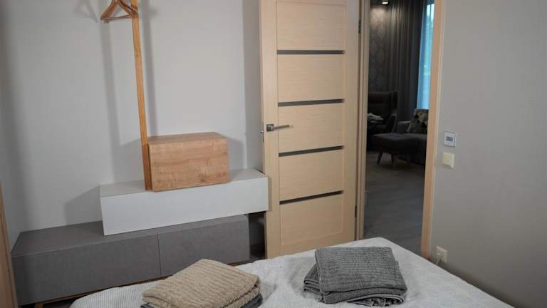 Das klimatisierte Apartment im Dizaina apartamenti Saules koks besteht aus einem Schlafzimmer, einem Wohnzimmer und einer voll ausgestatteten Küche mit Kühlschrank und Wasserkocher. Das Apartment bietet zudem ein Badezimmer mit Dusche und Haartrockner. Handtücher und Bettwäsche werden gestellt.