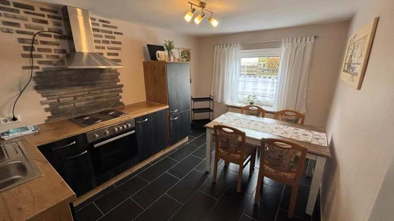 Die Küche im Ferienapartment ist ausgestattet mit einem Kühlschrank, einem Ofen, einem Toaster, einer Kaffeemaschine sowie einem Wasserkocher.