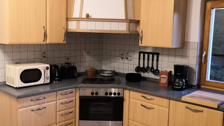 Die Ferienunterkunft ist mit einer voll ausgestatteten Küche ausgestattet, die einen Kühlschrank, eine Mikrowelle, einen Ofen, eine Herdplatte sowie eine Kaffeemaschine und einen Wasserkocher umfasst. Für Gäste, die keine Zeit zum Kochen haben, gibt es die Möglichkeit, Lebensmittel liefern zu lassen (gegen Gebühr). Es kann auch die Möglichkeit für eine kontaktlose Essenslieferung in die Unterkunft genutzt werden.