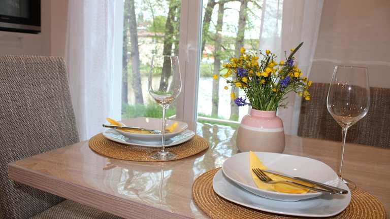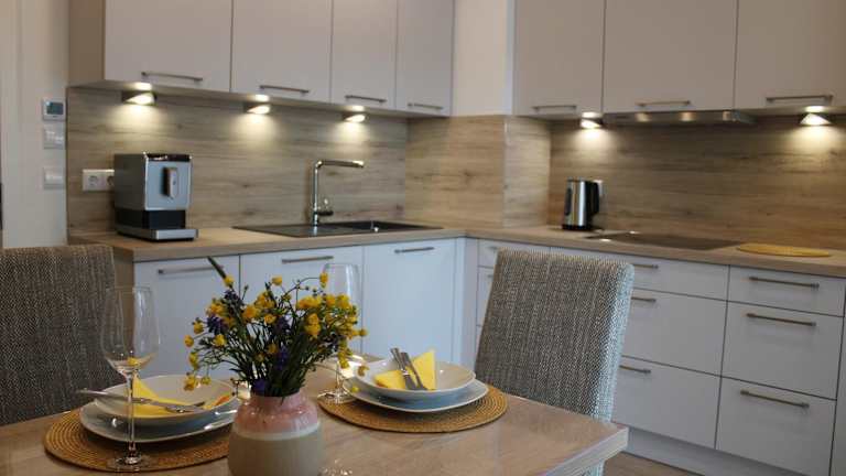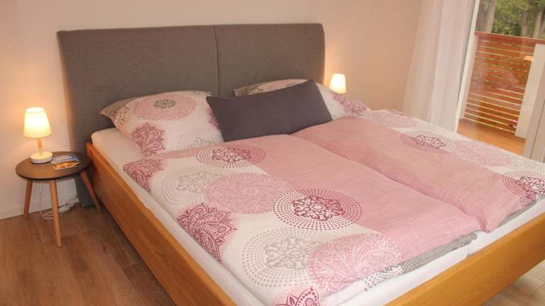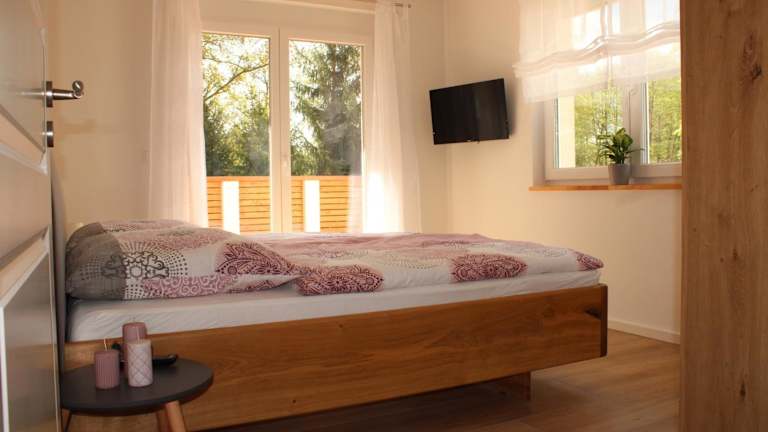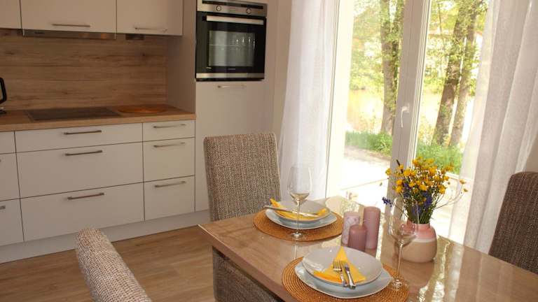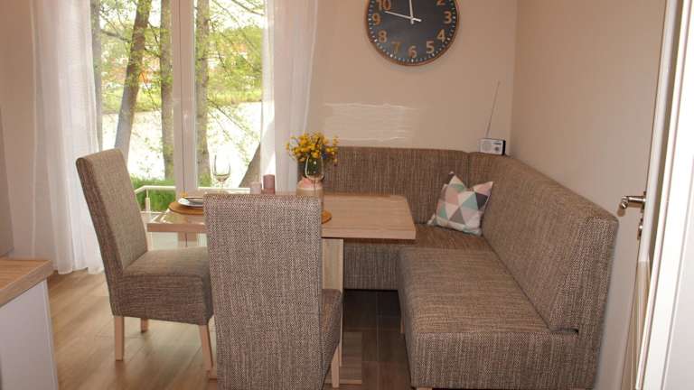 Die Ferienwohnung im Ferienhaus am Mühlteich besteht aus zwei Schlafzimmern, einem Wohnzimmer sowie einer gut ausgestatteten Küchenzeile, die mit einem Kühlschrank und einem Geschirrspüler ausgestattet ist. Handtücher und Bettwäsche werden bereitgestellt, und die Terrasse lädt zum Verweilen ein.