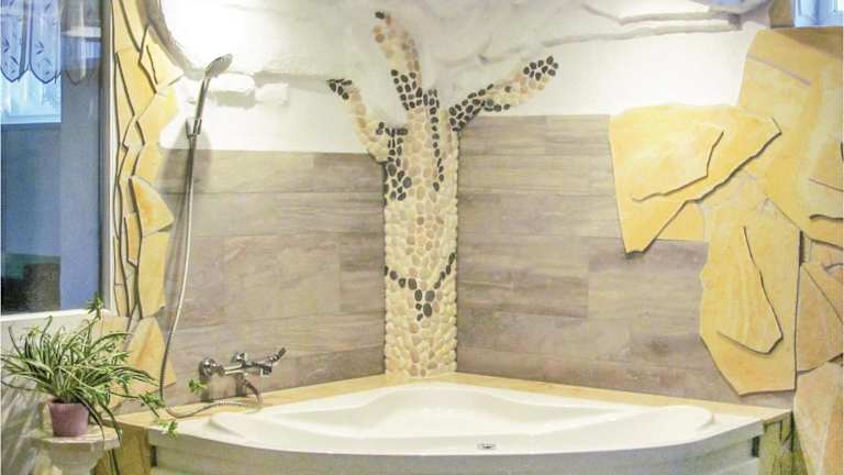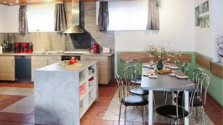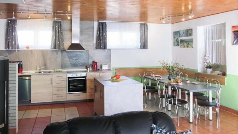 Die Zimmer umfassen fünf Schlafzimmer und zwei Badezimmer, ausgestattet mit einer Dusche. Die Küche ist mit einem Kühlschrank, einem Geschirrspüler und einer Mikrowelle ausgestattet. Ein Wohnzimmer und Essbereich sind ebenfalls vorhanden. Ein Blu-ray-Player sowie ein TV stehen den Gästen zur Verfügung.