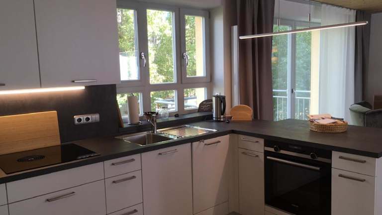 Die Ferienwohnung ist mit einer voll ausgestatteten Küchenzeile mit einem Kühlschrank und einer Kaffeemaschine ausgestattet, was die Zubereitung von Mahlzeiten ermöglicht.