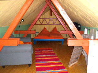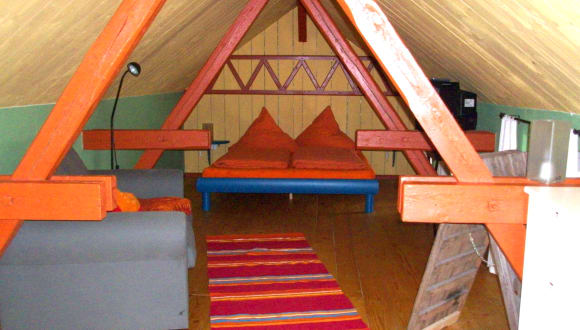Bei dem Haus handelt es sich um ein historisches Fachwerkgebäude, mit zwei Etagen. In der unteren Etage befindet sich eine Eßecke mit offener Küche, so wie das Badezimmer. Die offene obere Etage erreicht man über eine schmale, etwas steile Treppe. Dort findet man ein Sofa, so wie ein konfortables Bett.