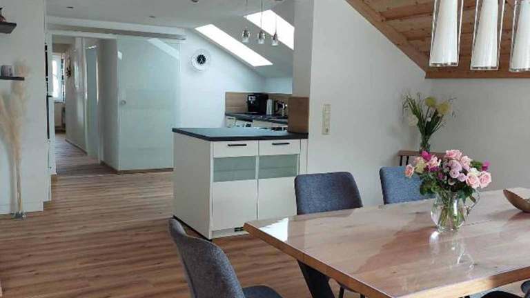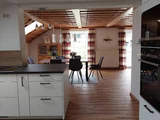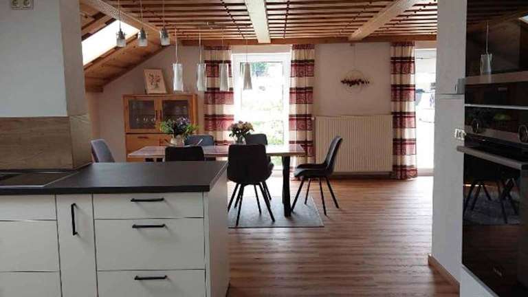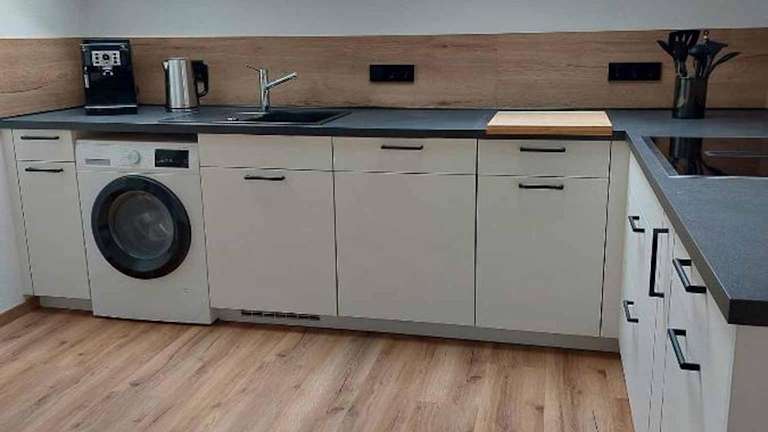 Die voll ausgestattete Küche im Ferienhaus ermöglicht die Zubereitung eigener Mahlzeiten. Es sind Einrichtungen wie ein Kühlschrank, Geschirrspüler, und eine Kaffeemaschine vorhanden.