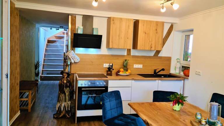 Für die Verpflegung sind im Ferienhaus eine gut ausgestattete Küche mit Kühlschrank und Geschirrspüler vorhanden. Zudem besteht die Möglichkeit, Essenslieferungen in die Unterkunft zu organisieren. Eine Grillmöglichkeit sorgt für geselliges Beisammensein im Freien.