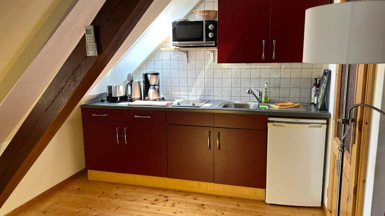 Das Ferienhaus verfügt über ein Schlafzimmer, ein Wohnzimmer und eine voll ausgestattete Küche, die mit einem Kühlschrank und einer Kaffeemaschine ausgestattet ist. Zudem gibt es ein Badezimmer mit einer Dusche. Handtücher und Bettwäsche werden bereitgestellt. Die Wohnung ist klimatisiert und bietet einen Gartenblick.