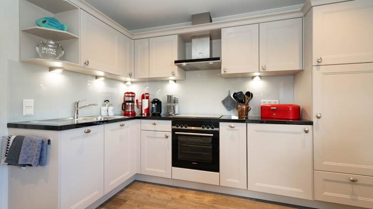 Das Ferienhaus ist ausgestattet mit 2 Schlafzimmern, einem Flachbild-TV und einer voll ausgestatteten Küche, die einen Kühlschrank, Geschirrspüler, Waschmaschine, Ofen und Mikrowelle beinhaltet.