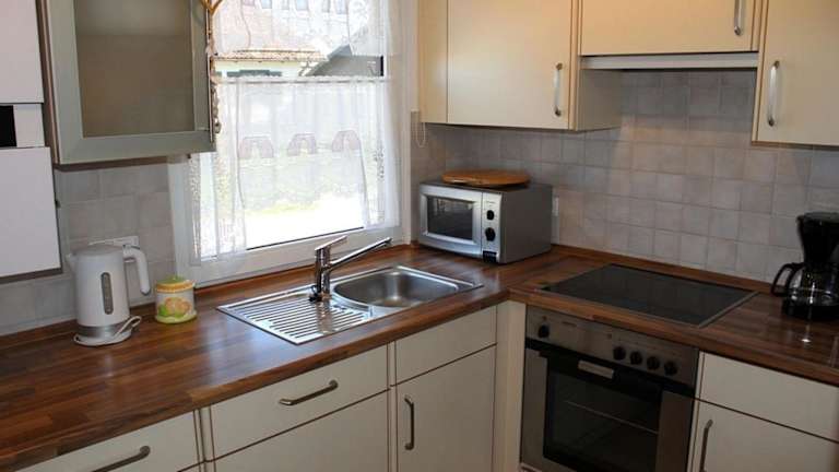 Die Küchenzeile des Ferienhauses ist ausgestattet mit einem Kühlschrank, einem Geschirrspüler, einem Ofen sowie einer Kaffeemaschine und einem Wasserkocher. So besteht die Möglichkeit, eigene Mahlzeiten zuzubereiten.