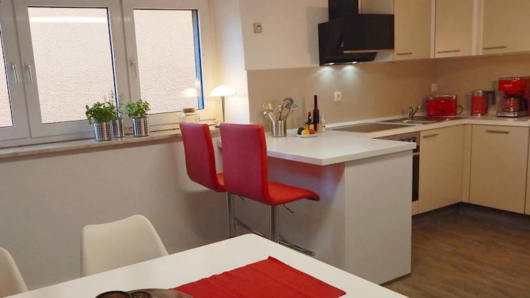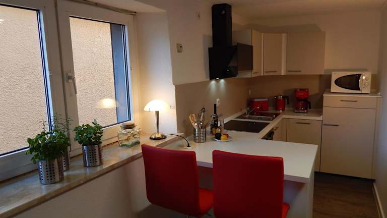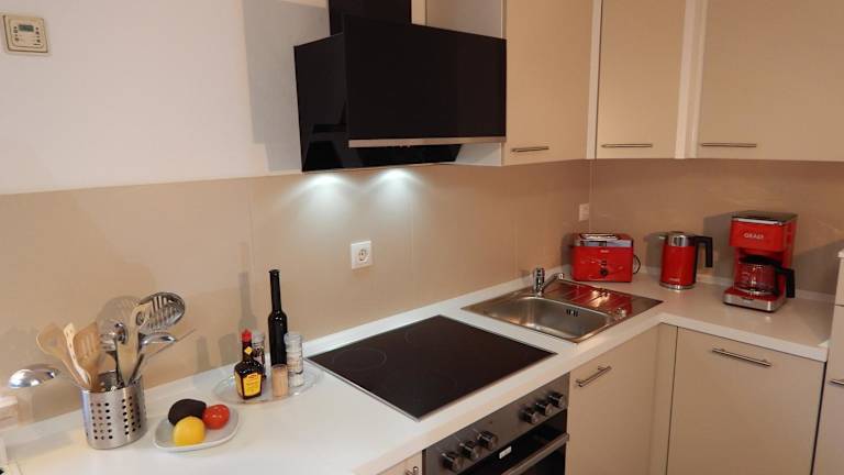 Die Ferienwohnung ist mit einer modernen Küche ausgestattet, die einen Kühlschrank, Geschirrspüler, Ofen, Kaffeemaschine und Wasserkocher umfasst.