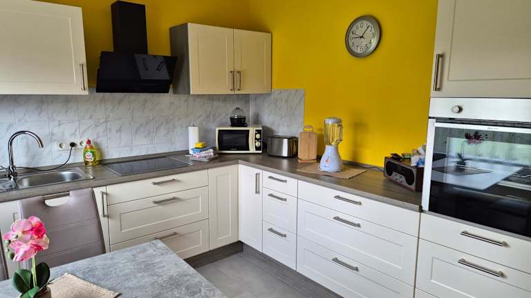 Das Ferienhaus umfasst ein Schlafzimmer, ein Wohnzimmer und eine gut ausgestattete Küche mit Kühlschrank und Geschirrspüler. Es verfügt über einen Flachbild-TV und ein Badezimmer mit Dusche. Von der Terrasse aus geniessen Gäste den Blick auf den Garten.