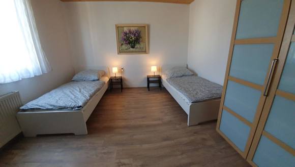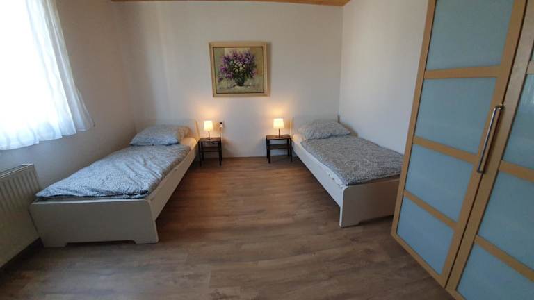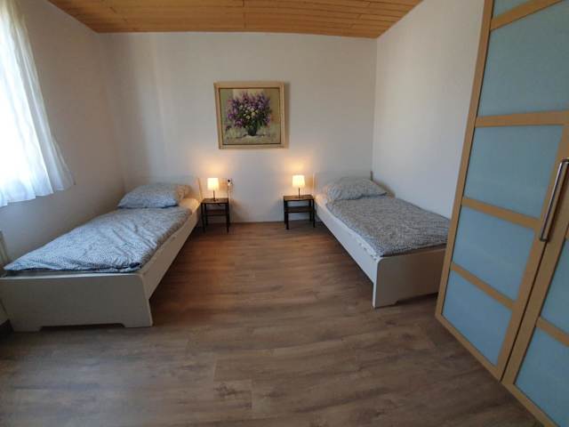 Die Ferienwohnung bietet Platz für Gäste in zwei Schlafzimmern und einem Wohnzimmer. Die voll ausgestattete Küche beinhaltet einen Kühlschrank und eine Kaffeemaschine. Das Badezimmer ist mit einer Dusche und einem Haartrockner ausgestattet. Handtücher und Bettwäsche werden bereitgestellt.