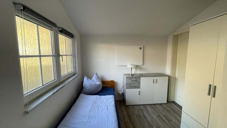 Die Ferienwohnung umfasst ein Schlafzimmer, ein Wohnzimmer und ein Badezimmer mit Dusche. Eine voll ausgestattete Küchenzeile mit Kühlschrank und Kaffeemaschine ist vorhanden. Handtücher und Bettwäsche werden bereitgestellt.