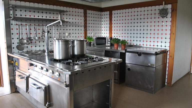 Die Unterkunft verfügt über eine voll ausgestattete Gemeinschaftsküche, die eine Ausstattung mit Kühlschrank, Kaffeemaschine, Geschirrspüler, Ofen, Mikrowelle und Wasserkocher bietet, sodass die Gäste ihre eigenen Mahlzeiten zubereiten können.