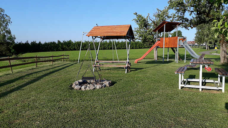 Hofeigene Liegewiese, Spielplatz mit Kletterhaus, Rutschen, Schaukeln, Volleyball/Badminton-Netz und Fussballtoren. Dieser befindet sich direkt am Haus.