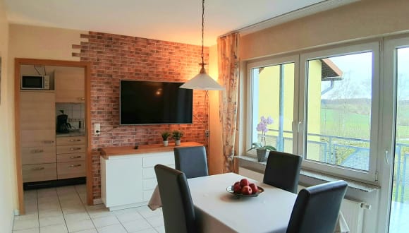 Umgeben von Wiesen und Feldern liegt die Ferienwohnung idyllisch und ruhig, abseits vom Straßenverkehr. Großer Kinderfuhrpark, Spielplatz, überdachtes Riesentrampolin, Indoor-Spielbereich mit Vorgelnestschaukel.