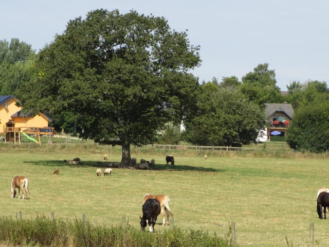 Egal, ob Sonne oder Regen…hier bei uns auf dem Feinenhof gibt es immer was zu erleben. Genießen Sie die Umgebung doch einfach bei einer ausgiebigen Wanderung oder mit dem E-Bike. Diese können gegen Gebühr am Hof geliehen werden. Bei Regen bieten wir ein spezielles Hofprogramm an. Nutzen Sie unserer Wellnessangebote, treiben Sie Sport oder toben Sie mit Ihren Kindern in der Scheune. Entdecken Sie unsere Hofprogramme: Innennprogamme: Während Ihres Urlaub auf dem Bauernhof haben Sie eine Vielzahl von Möglichkeiten Ihre Freizeit auch bei schlechtem Wetter so zu gestalten, dass keine Langeweile aufkommt. Unser Bauernhof ist einer der wenigen Höfe in Rheinland-Pfalz, der über ein eigenes Hallenbad verfügt. Sollte es in Ihrem Bauernhofurlaub einmal regnen ist die Nutzung des Hallenbades eine wirkliche Alternative für die ganze Familie . Im Schwimmbadkomplex befinden sich darüber hinaus ein großzügig ausgestatteter Fitnessraum und ein Saunabereich mit Infrarotkabine, Dampfbad und finnischer Sauna. Eine überdachte Spielscheune mit Rollenbahn für Kinder, Kletterwand, Trampolin, Hüpfburg, Kicker und Tischtennisplatte runden das Angebot an hofinternen Urlaubsangeboten ab. Natürlich mangelt es bei Ihrem Bauernhofurlaub nicht an klassischen Schlechtwetteralternativen, wie Spielmöglichkeit in der Strohscheune, Streicheln der Tiere in den Stallungen, Stockbrot in der Grillhütte oder Kaffeeplausch in der Hausbar. Außenprogramme: Während Ihres Urlaub auf dem Bauernhof haben Sie eine Vielzahl von Möglichkeiten Ihre Freizeit zu gestalten. Auf dem Bauernhofgelände befinden sich mehrere Grillplätze, die unseren Feriengästen kostenlos zur Verfügung stehen. Vielfältige Spielgeräte und Kinderfahrzeuge sorgen während Ihres Hofurlaubs für zufriedene Gesichter bei Kindern und Jugendlichen. Aber auch der kleine Abenteuerwald mit Baumhaus, an dem die Kinder selbst arbeiten können, erfreut die großen und kleinen Handwerker. Ein Urlaub auf dem Bauernhof in der Eifel kann aufgrund seines vielfältigen Angebotes mit keiner anderen Urlaubsform verglichen werden und bietet speziell für Familien mit Kindern ungeahnte Möglichkeiten. Sei es das Reiten auf unserem Reitplatz, die Fütterung der Tiere, das Angebot zur Freizeitgestaltung auf unserem Ferienhof ist groß. Aber auch für die Entspannung während der Urlaubstage wird gesorgt. Die komfortabel eingerichteten Ferienwohnungen sind alle mit Terrasse oder Balkon ausgestattet und von großzügigen Rasenfreiflächen umgeben. Eine gemütliche Freiluftterrasse, der Platz des Feinen Ausblicks, dient als Treffpunkt für die Urlaubsgäste. Von der Terrasse kann man bei einer Tasse Kaffee oder einem süßen Teilchen die Spielplätze im Nahbereich entspannt überschauen und seine Kinder beim Spiel beobachten. Familienprogramme: Der Ferienhof Feinen bietet Ihnen während Ihres Bauernhofurlaubs in der Eifel zahlreiche Familienprogramme an, zu denen Sie sich während Ihres Hofurlaubs anmelden können. Reiten: Reiten auf Ponys und Pferden darf während eines Urlaub auf dem Bauernhof natürlich nicht fehlen. Mehrmals wöchentlich wird von uns ein kostenloses Reiten für Kinder auf dem Reitplatz organisiert. Geführte Geländeritte ins Naturschutzgebiet „Schönecker Schweiz“ können bei unseren erfahrenen Reitlehrerinnen gebucht werden. Allerdings weisen wir darauf hin, dass Sie bei uns keine Reitferien für Ihre Kinder im klassischen Sinne buchen können. Wagenfahrt: Schon fast traditionell ist unsere Wagenfahrt durch die Wälder rund um den Eifelort Fleringen. Der Bauer fährt Sie während Ihres Hofurlaubs einmal kostenlos – damit jeder einmal mitfahren kann – mit dem Traktor und einem speziell umgebauten Anhänger zu beliebten Sehenswürdigkeiten und Ausflugszielen im Nahbereich des Bauernhofes. Die Fahrt durch Schlammlöcher, zerfahrene Waldwege und Dickicht ist ein Abenteuer für Groß und Klein. Auf unserem GEH-klassifizierten Bauernhof halten wir verschiedene vom auststerben bedrohten Nutz- und Haustierrassen. Unter anderem finden Sie bei uns an Tieren: Schafe, Ziegen, Pferde, Ponys, Lamas, Kaninchen, Katzen, Schweine und viele mehr..