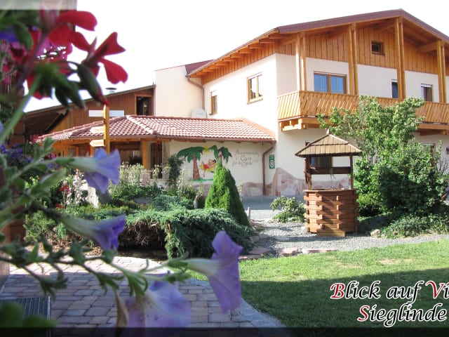 Nicht nur für Kinder ist unser Ferienhof Spaß und Abenteuer pur. Durch die Ortsrandlage und das große Areal können sich Kinder weitgehend frei bewegen. Die Kinder können auf unserem Ferienhof natürlich einige Tiere entdecken und anfassen: Rinder, Kälber, Pferde, Ponys, Ziegen, Katzen alles, was zu einem richtigen Bauernhof gehört! Unser Streichelzoo, wo sich Hasen und Meerschweinchen tummeln ist in der Scheune integriert. Die Tiere wohnen in kleinen Häuschen und rund herum an den Wänden kann ein Märchenpanorama bewundert werden. Im Heu auf den Spielplatz herumtoben, im Baumhaus wohnen, mit dem "Kosertal-Express" eine abenteuerliche Rundfahrt machen. Den Bauern beim Füttern helfen oder zum Heu einholen mitfahren, sowie mit interessierten Jungbauern die moderne Landtechnik erklären und im Einsatz dabei zu sein. Mit den Eltern am Lagerfeuer Stockbrot backen oder einfach nur Grillen oder im hauseigenen Badeweiher plantschen und Floß fahren... Zwischendurch könnt Ihr auch Trampolin springen, sich beim Fußball, Tischtennis, Volleyball und Federball testen oder am Profi-Kicker und Billardtisch zeigen, was man drauf hat. Ist das Wetter mal nicht so toll, hat der Ferienhof für die Kinder und Erwachsene Vieles zu bieten: Spielhalle "Route 66" mit Dartautomat, Kicker und Billiardtisch. Spielburg „Rabenstein“ In der Scheune Heuhüpfen – Heubastelkurse nach Absprache Besuch in der eigenen Salzgrotte oder Sauna Massagen und Fußpflege Zubereitung von Speisen und Indoor Grillen Kinderdisco und gesellige Abende in der Koseralm Für Wander- und Naturfreunde bietet die Umgebung unseres Ferienhofes unbegrenzte Möglichkeiten zur aktiven Freizeitgestaltung. Der neu angelegte "Naturlehrpfad durch das Kosertal" ist auch für ungeübte Wanderer und Spaziergänger ein wahres Erlebnis. Einer der schönsten Wanderwege im Frankenwald, der "Mühlenweg" führt fernab von verkehrsreichen Straßen vorbei an neun ehemaligen Mühlen auf 18 Kilometern durch Wälder und Auen entlang an idyllischen Frankenwaldbächen. Für Radfahrer besteht die Möglichkeit eigene E Bikes zu mieten und die Umgebung zu erkunden. All dies ist nicht nur für die "Kleinen" ein Erlebnis. Auch für die Eltern, Ruhesuchende und Aktivurlauber der richtige Ort um die schönste Zeit des Jahres auf den Ferienhof zu verbringen.