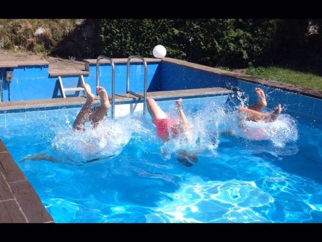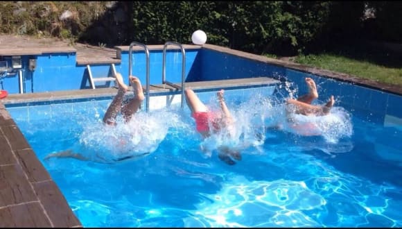 Beheiztes Schwimmbad, Reiten, eigener Badesee, Trampolin, Fahrgeräte, Kicker, Tischtennis, Spielplatz mit Schaukel, Rutsche und Sandhaufen