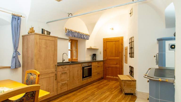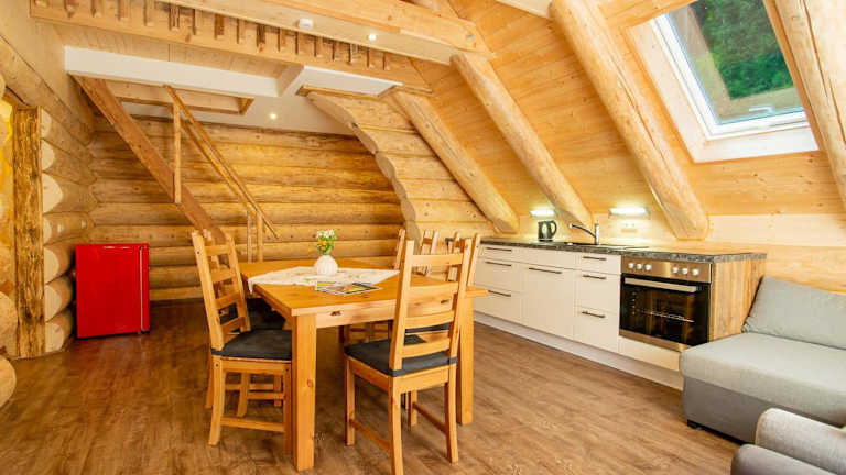 Die Wohneinheiten verfügen über eine voll ausgestattete Küche mit Kühlschrank, Herdplatte, Ofen, Toaster, Kaffeemaschine und Wasserkocher, sodass die Gäste selbständig kochen können. Ein Essbereich ist ebenfalls vorhanden.