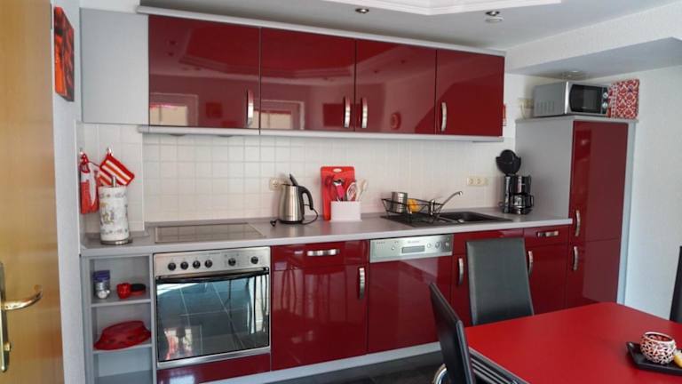 Die Ferienwohnung bietet eine gut ausgestattete Küche mit Kühlschrank und Geschirrspüler. Im Restaurant werden Gerichte serviert, und die Bar lädt zu gemütlichen Stunden ein. Gäste können bei einem guten Glas Wein oder Sekt entspannen.