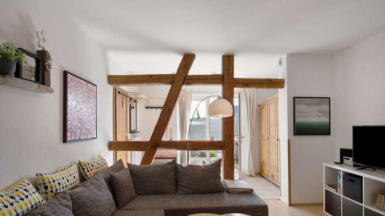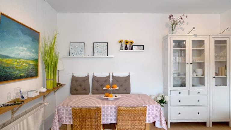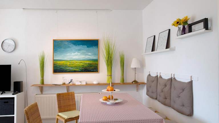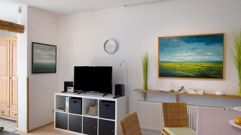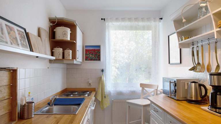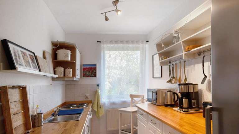 Die Ferienwohnung besteht aus einem Schlafzimmer, einem Wohnzimmer und einer voll ausgestatteten Küche, die mit einem Kühlschrank und einer Kaffeemaschine ausgestattet ist. Des Weiteren sind ein Badezimmer mit Dusche und kostenlosen Pflegeprodukten vorhanden. Handtücher und Bettwäsche werden bereitgestellt.