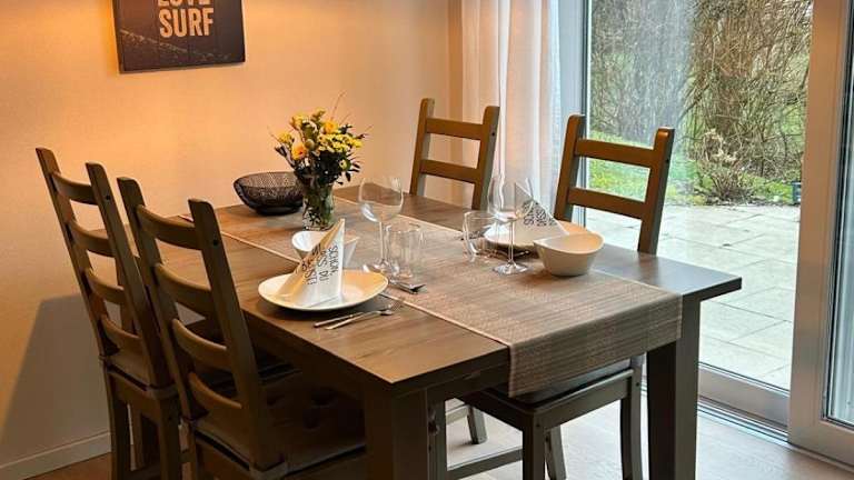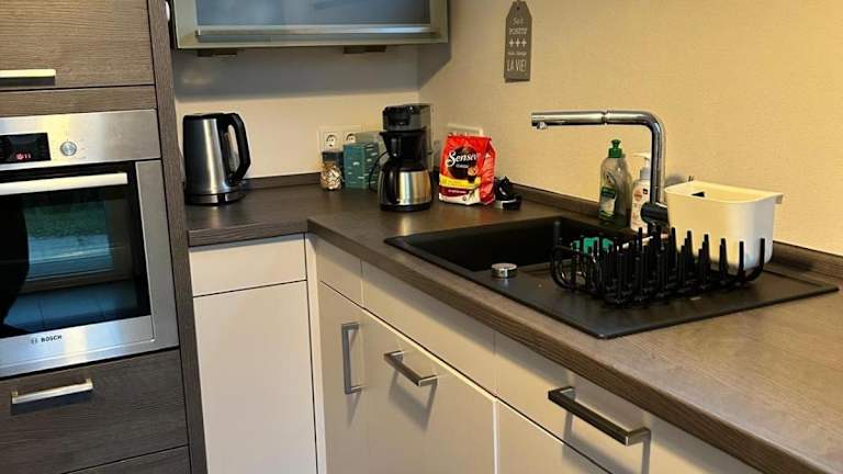 Die Ferienwohnung besteht aus einem Schlafzimmer, einem Wohnzimmer, einer voll ausgestatteten Küche mit Kühlschrank und Kaffeemaschine sowie einem Badezimmer mit Dusche und Badewanne. Ein Fernseher mit Satellitenkanälen sorgt für Unterhaltung.