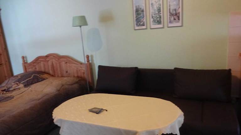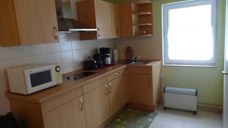 Die Ferienwohnung verfügt über eine Küchenzeile mit Kühlschrank und Mikrowelle, die es Gästen ermöglicht, sich selbst zu verpflegen.