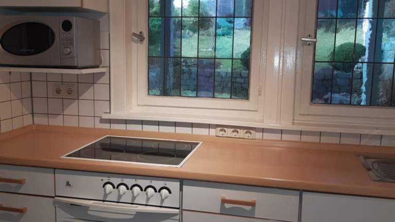 In der Ferienwohnung steht eine voll ausgestattete Küche zur Verfügung. Diese beinhaltet einen Kühlschrank, einen Ofen, eine Herdplatte, eine Mikrowelle, einen Toaster, eine Kaffeemaschine sowie einen Wasserkocher für die Zubereitung von eigenen Mahlzeiten. Es sind keine spezifischen Verpflegungsmöglichkeiten oder Restaurants vor Ort angegeben.
