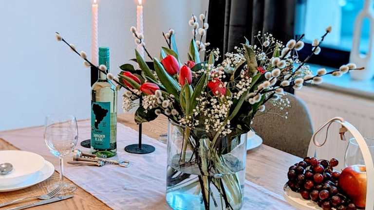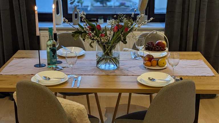 Die Ferienwohnung ist mit einer voll ausgestatteten Küche eingerichtet, die Kühlschrank, Geschirrspüler, Waschmaschine, Ofen und Toaster umfasst. Grillmöglichkeiten sind im Garten vorhanden, jedoch keine spezifischen Informationen zur Verpflegung.