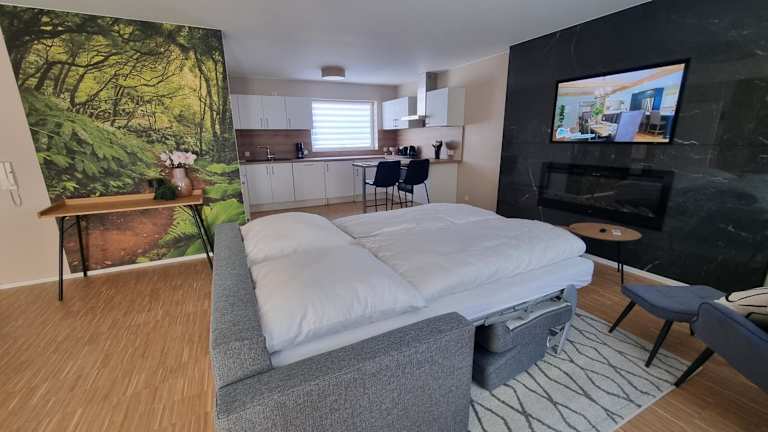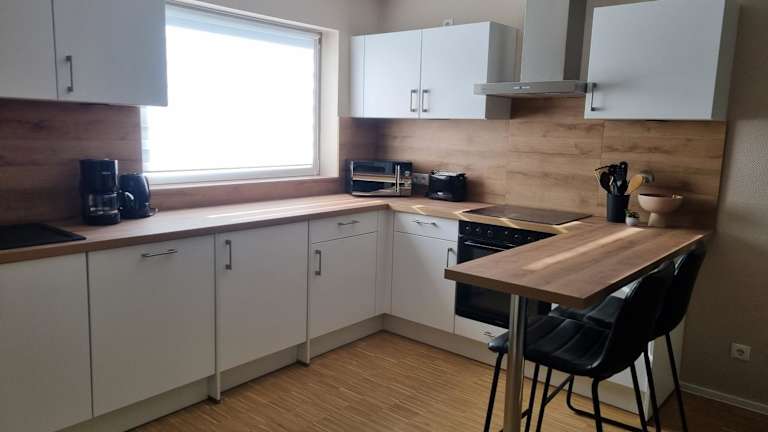 Die Ferienwohnung besteht aus einem Schlafzimmer, einem Wohnzimmer sowie einer voll ausgestatteten Küche mit Kühlschrank und Kaffeemaschine. Es gibt ein Badezimmer mit Dusche und Haartrockner. Handtücher sowie Bettwäsche werden zur Verfügung gestellt. WLAN ist in allen Bereichen kostenfrei verfügbar und Privatparkplätze sind direkt vor Ort vorhanden.
