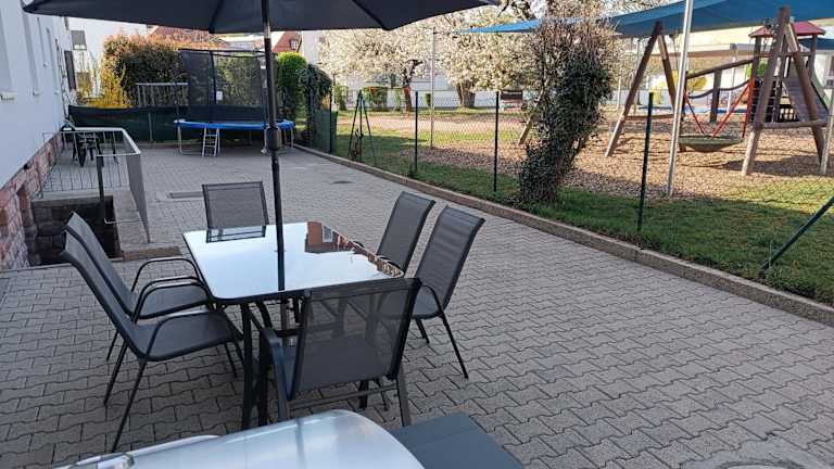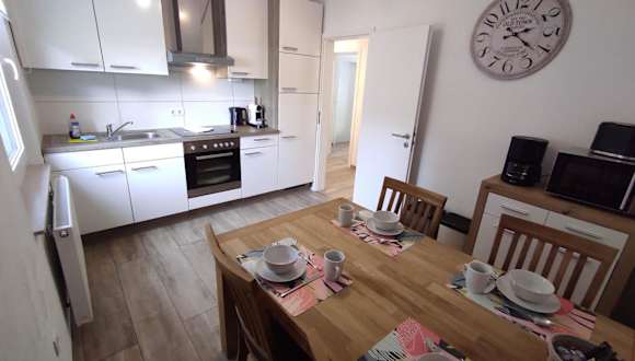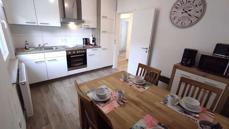 Die Ferienwohnung verfügt über eine voll ausgestattete Küche mit Kühlschrank, Ofen, Mikrowelle und Herdplatte, sowie Kaffeemaschine und Wasserkocher. Eine Terrasse mit Grillmöglichkeiten lädt zum Verweilen im Freien ein.