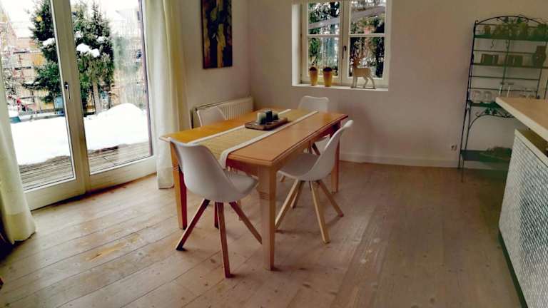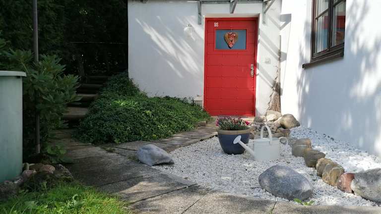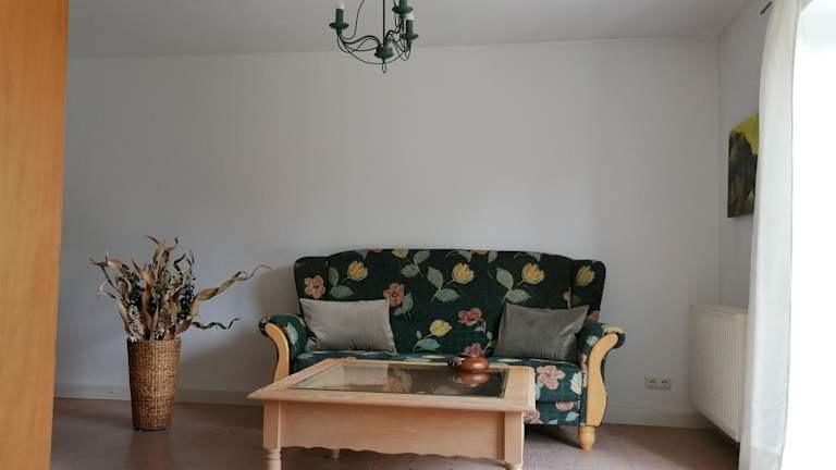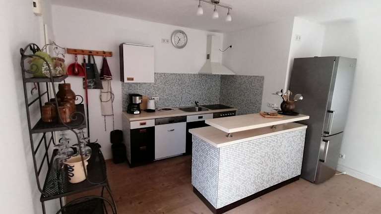 Die Ferienwohnung hat eine Terrasse und umfasst ein Schlafzimmer, ein Badezimmer mit Dusche und Badewanne, sowie ein Wohnzimmer mit einem Sitz- und Essbereich. Die gut ausgestattete Küche beinhaltet einen Kühlschrank, Geschirrspüler und Ofen. Handtücher und Bettwäsche werden bereitgestellt.
