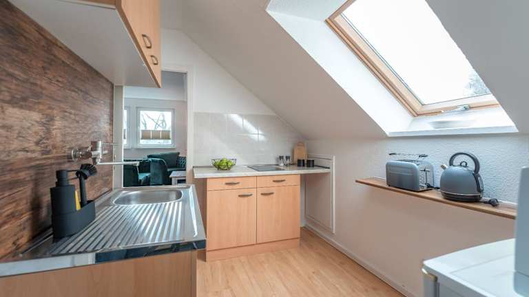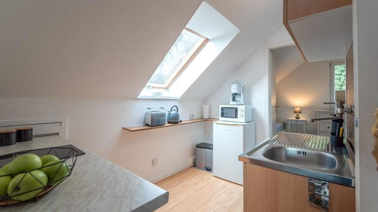 Die Ferienwohnung bietet zwei Schlafzimmer sowie eine voll ausgestattete Küche mit Kühlschrank und Mikrowelle. Ein Badezimmer mit Dusche und Haartrockner gehört ebenfalls zur Ausstattung. Handtücher und Bettwäsche sind gegen Aufpreis verfügbar. Die Unterkunft bietet einen kostenlosen Privatparkplatz auf dem Gelände.