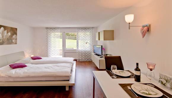 Die Ferienwohnung verfügt über ein Schlafzimmer und ein Badezimmer. Zur Ausstattung gehören eine voll ausgestattete Küche, ein Essbereich, sowie ein Flachbild-TV mit Satellitenkanälen. Die Gäste können die Terrasse mit Bergblick sowie den Balkon nutzen. Handtücher und Bettwäsche werden gegen Aufpreis zur Verfügung gestellt.