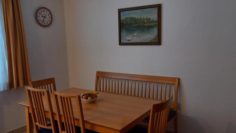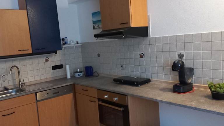 Die voll ausgestattete Küche der Ferienwohnung umfasst einen Kühlschrank und eine Kaffeemaschine, was zur Zubereitung eigener Mahlzeiten einlädt. Ein gemütlicher Essbereich ergänzt das Angebot.
