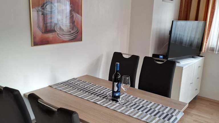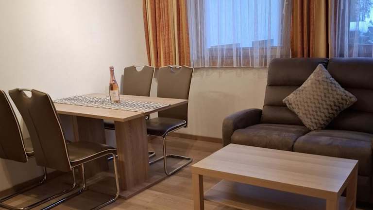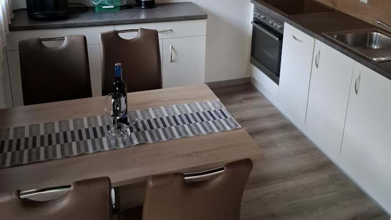 In jeder Wohneinheit der Chasa Val Bella befindet sich eine voll ausgestattete Küche mit einem Esstisch, sodass Gäste sich bequem selbst verpflegen können. Hierzu stehen unter anderem ein Kühlschrank, ein Geschirrspüler, ein Ofen sowie eine Kaffeemaschine und ein Wasserkocher zur Verfügung.