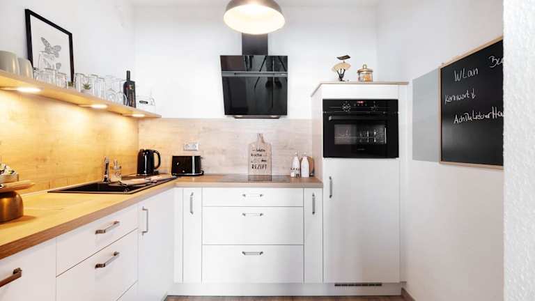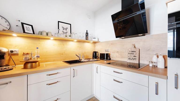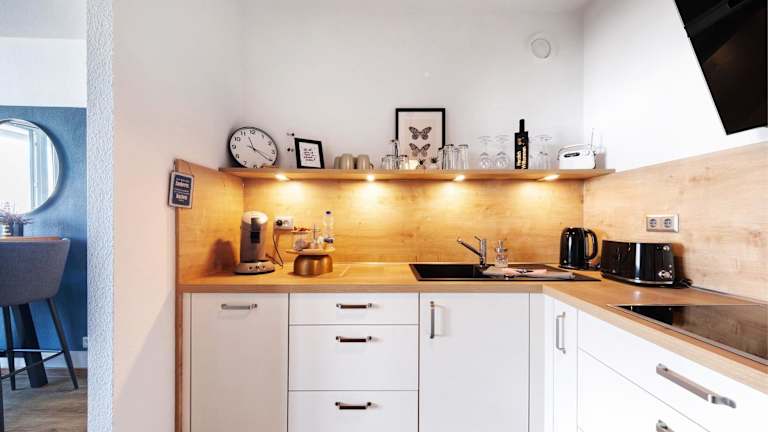 Die Ferienwohnung umfasst ein Schlafzimmer, ein Wohnzimmer, einen TV sowie eine gut ausgestattete Küche mit Kühlschrank und Geschirrspüler. Das Badezimmer ist mit einer Dusche ausgestattet. Bei Ankunft werden Handtücher und Bettwäsche bereitgestellt.