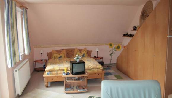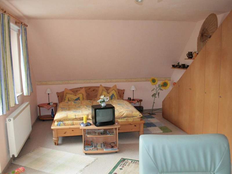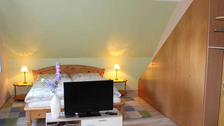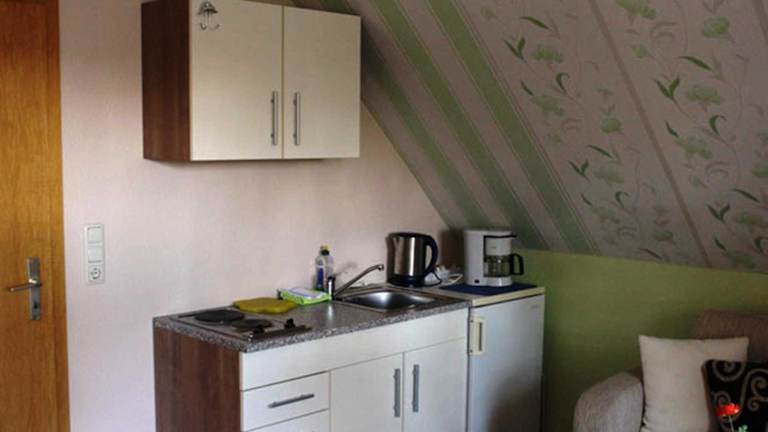 Die Ferienwohnung beinhaltet ein Schlafzimmer sowie eine gut ausgestattete Küchenzeile mit Kühlschrank und Herdplatte. Ein Badezimmer mit Dusche ist ebenfalls vorhanden. Handtücher und Bettwäsche werden bereitgestellt. Zudem steht ein Fernseher mit Satellitenkanälen zur Verfügung.