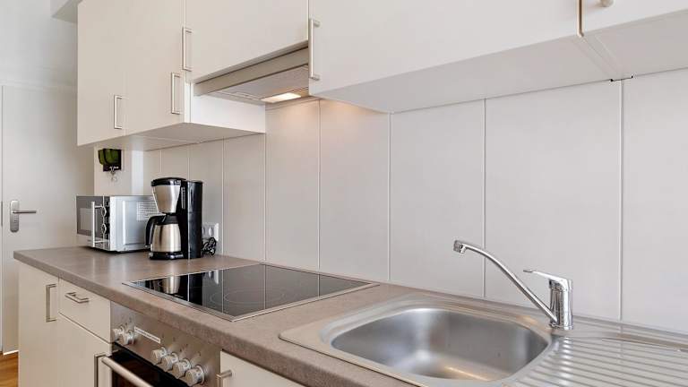 Die Ferienwohnung verfügt über eine gut ausgestattete Küche mit Kühlschrank, Geschirrspüler, Ofen, Mikrowelle, Herdplatte, Toaster, Kaffeemaschine und Wasserkocher. Gäste haben die Möglichkeit, ihre eigenen Mahlzeiten zuzubereiten.