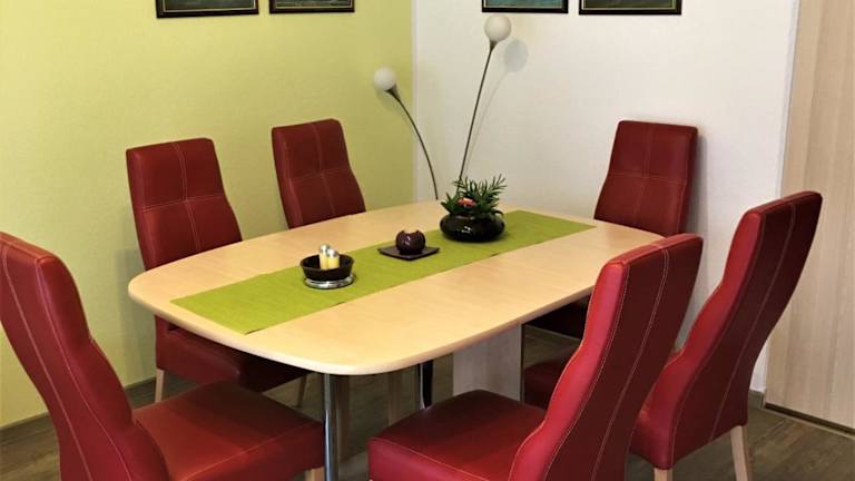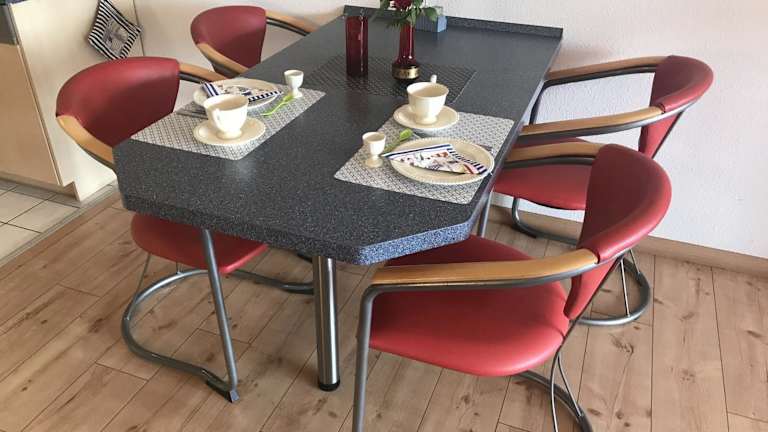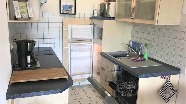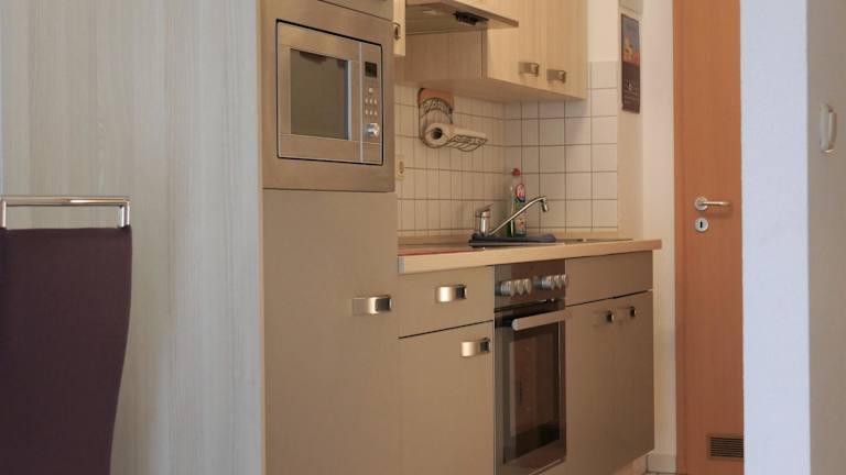 Die voll ausgestattete Küche bietet eine Mikrowelle, Herdplatte, Kühlschrank, Ofen, Toaster, Kaffeemaschine und Wasserkocher, wodurch eine selbständige Verpflegung möglich ist.