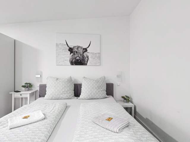 Die Ferienwohnung umfasst 1 Schlafzimmer, eine Küche mit Kühlschrank und Mikrowelle sowie 1 Badezimmer mit Dusche. Handtücher und Bettwäsche werden bereitgestellt. Die Unterkunft ist als Nichtraucherzimmer konzipiert und es gibt einen Raucherbereich.