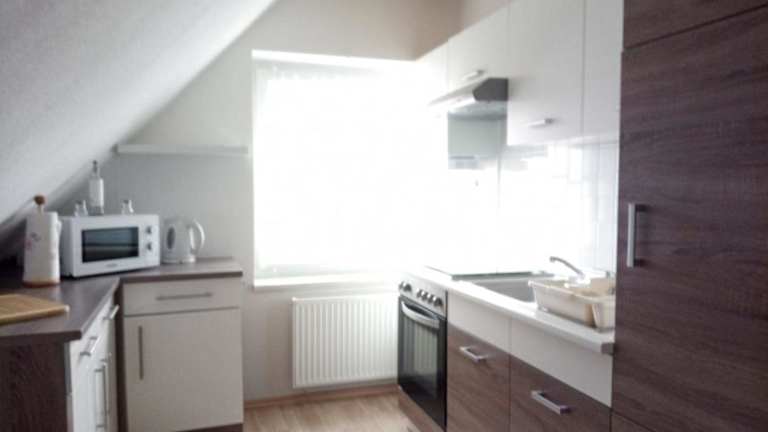 Die Ferienwohnung verfügt über eine Küchenzeile mit Kühlschrank, Ofen und Kaffeemaschine, die es Gästen ermöglicht, eigenständig zu kochen. Frühstücksoptionen sind nicht angegeben.