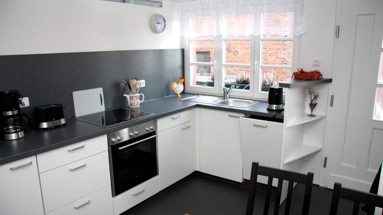 Die Ferienwohnung ist mit einer gut ausgestatteten Küche versehen, die einen Kühlschrank und einen Ofen beinhaltet.