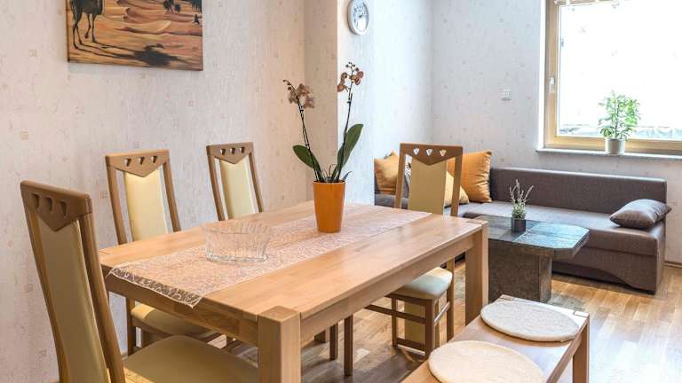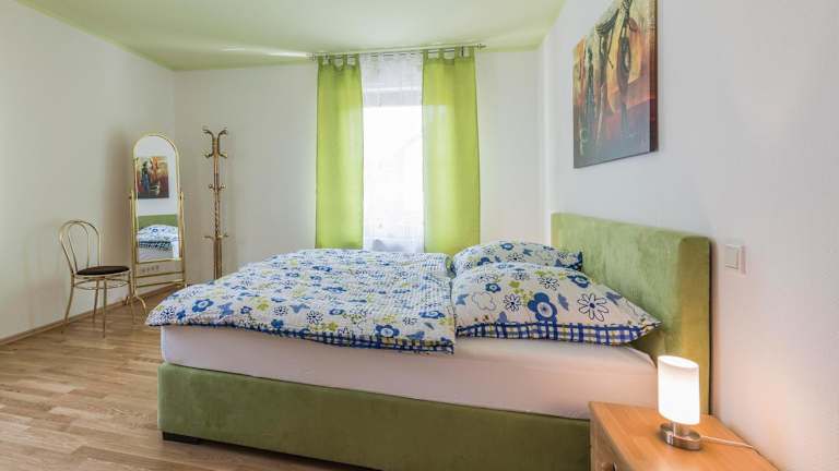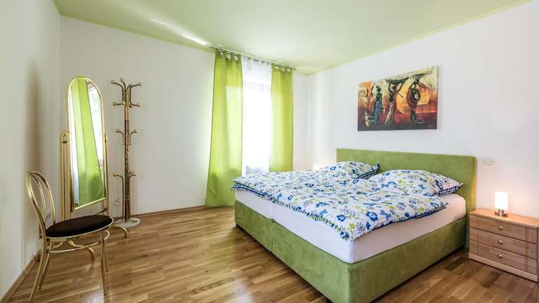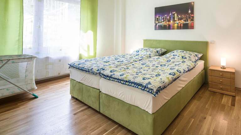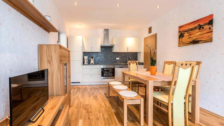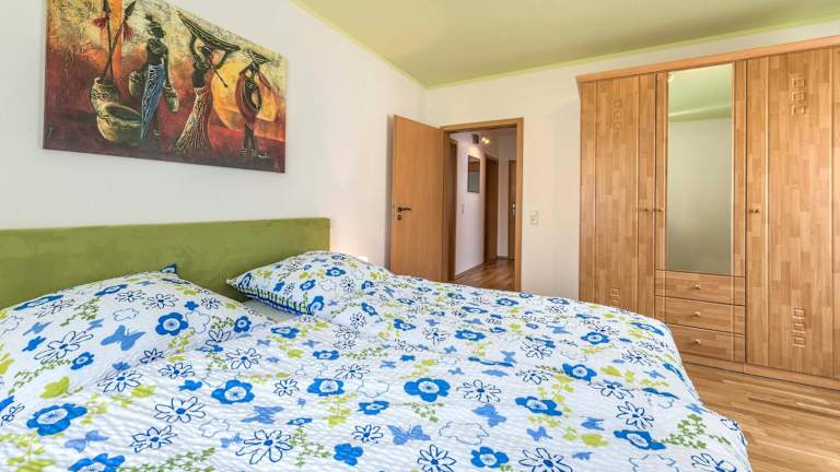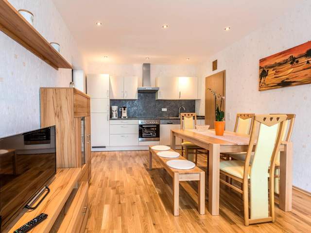 Die Ferienwohnung verfügt über 2 Schlafzimmer und ein Wohnzimmer mit einem Satelliten Flachbild-TV. Die gut ausgestattete Küche ermöglicht eine selbständige Zubereitung von Mahlzeiten. Es gibt ein Badezimmer mit Dusche und Badewanne. Handtücher und Bettwäsche werden bereitgestellt.