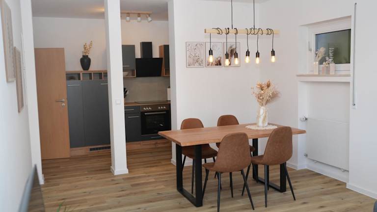 Es gibt die Möglichkeit zur Essenslieferung in die Unterkunft. Ein Minimarkt ist vor Ort vorhanden, und in der Ferienwohnung befindet sich eine gut ausgestattete Küche mit Kühlschrank und Geschirrspüler für die Selbstversorgung.