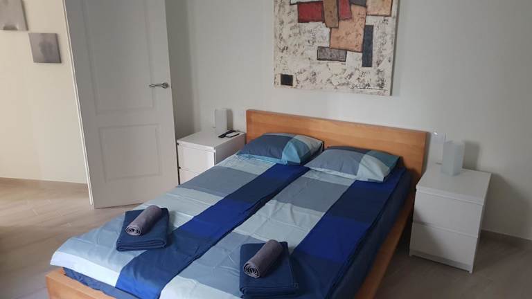 Die Ferienwohnung umfasst zwei Schlafzimmer, eine Küche ausgestattet mit Geschirrspüler und Ofen sowie ein Badezimmer mit Dusche, Haartrockner und Waschmaschine. Handtücher und Bettwäsche werden bereitgestellt.