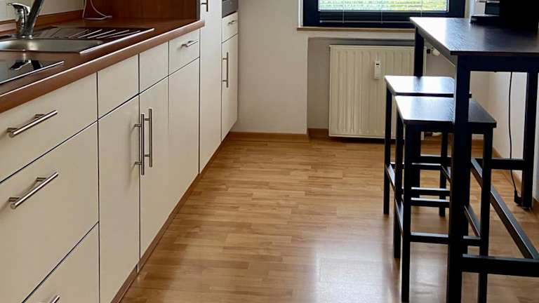 Die Ferienwohnung ist mit einer voll ausgestatteten Küche versehen, die einen Kühlschrank und eine Kaffeemaschine beinhaltet, ideal für die Zubereitung eigener Mahlzeiten.
